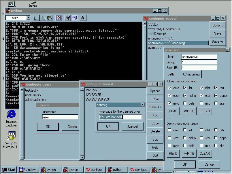 - Windows 95, showing python window with debugging output